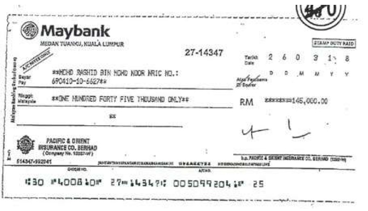 [11] Pacific & Orient Insurance Company Berhad ("P&O Insurance"), who is Dr Wahab's insurer, issued a cheque ("P&O Cheque") in favour of Rashid for the sum of RM 145,000.00. Whereas Dr Arul's and the Hospital's insurers each issued cheques for the sum of RM 25,000.00 and RM 30,000.00 respectively in favour of "P.S. Ranjan & Co Advocates & Solicitors — Client Account'. An image of the P&O Cheque is reproduced below: