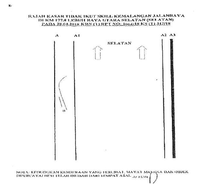 [5] On 27 April 2018, at about 11.45pm, the Deceased was riding along the Highway in a convoy with six other motorcyclists from Kuala Ketil, Kedah, to Banting, Selangor. At KM177.8 of the Highway, the Deceased hit a yellow-orange object along A1 (shown in the sketch plan below) and was flung off his motorcycle onto the middle of the highway at A1-A2; his motorcycle fell onto the side of the road along A1.