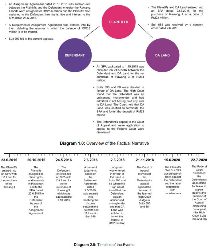 The present two appeals raised novel points of law concerning the Malaysian position on the common law restitutionary doctrine of total failure of consideration in light of the Federal Court's prior rulings in Berjaya Times Square Sdn Bhd v. M-Concept Sdn Bhd ("Berjaya Times Square") and Damansara Realty Bhd v. Bungsar Hill Holdings Sdn Bhd & Anor ("Damansara Realty"). The present appeals, in essence, concerned the Assignment Agreements involving four vacant parcels of land in the District of Gombak, Mukim Rawang, Selangor ("Rawang 4") assigned by the Plaintiffs/Applicants to the Defendant/Respondent for a consideration. These lands were acquired through a Sale and Purchase Agreement ("SPA") between the Plaintiffs and a land developer, DA Land Sdn Bhd ("DA Land"), which itself subsequently became involved in a broader sequence of separate proceedings involving the Plaintiffs on one hand and the Defendant on the other. The proceedings between the Plaintiffs and Defendant in the courts below proceeded on the legality of these contracts as the central issue for judicial determination, and the leave questions framed by the Plaintiffs primarily concerned the parties' rights and liabilities arising from these contractual arrangements. The Plaintiffs filed Appeal No 23 against the Court of Appeal's dismissal of their appeal and Appeal No 22 against the Court of Appeal's decision allowing the Defendant's appeal against the High Court's dismissal of the counterclaim.