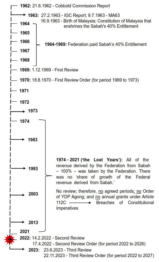 [202] On the facts herein, once the First Review Order was revoked by the Second Review Order which gave effect to the second review, the modification was also thereafter revoked. At that point, the Federation's duty to make the 40% Entitlement to the State of Sabah immediately came into effect for the period of the Lost Years. This event, occurring not in 1974 as is mandated by the Federal Constitution, but 48 years later, a fortiori, triggered the Federation's duty to make the 40% Entitlement to the State of Sabah and which the two Governments were mandated to consider in their second review.