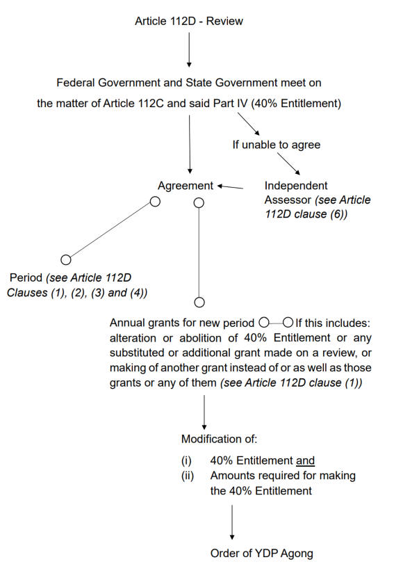 (2) A review as contemplated under art 112D of the FC must include the following elements: (i) meeting between the representatives of the Federal Government and the Sabah Government for the purpose of a review of the special grant; (ii) agreement between them as to a mandated fixed period of 5 years or another agreed period for the annual grant to be made (cls (1), (2), (3) and (4)); (iii) (a) agreement on the specified grant for each year in that mandated or agreed period, and (b) if agreement on the specified grants each year included alteration or abolition of the 40% Entitlement or any substituted or additional grant made on a review, or making of another grant instead of for as well as these grants or any of them for that agreed period; and (iv) then modification of the duty to make the 40% Entitlement and the amounts required for making the 40% Entitlement by an order of the Yang Di-Pertuan Agong. If in the process of carrying out the review under art 112D, the two Governments were unable to reach an agreement on any matter, it would be referred to an independent assessor, and his recommendations would be binding on the two Governments as if they were the agreement of those Governments as provided under cl (6) of art 112D. Taking the 1st respondent's case at the most, the only essential element under art 112D which would have been fulfilled by the purported ongoing review would have been that the two Governments had corresponded and/or met to broach the subject of a review of the special grant in 1974 and that this continued up until 2021. This amounted to procedural impropriety, was irrational and unreasonable. To accept the 1st respondent's argument on this issue would be to re-write art 112D so that the provision only required the Federal and State Governments to meet or correspond with each other on this matter. Taking it further, if accepted, the 1st respondent's interpretation would mean that the grant in 1973 might continue to apply indefinitely and even, ad infinitum. Likewise, it would allow the two Governments to embark on a never-ending on-going review. (paras 167-170)