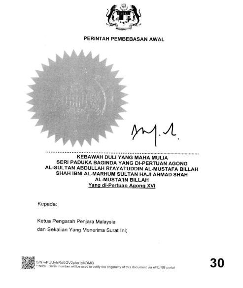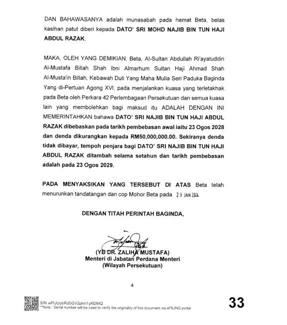 (vii) The 61st Pardons Board Meeting was held on 29 January 2024. Subsequent thereto, on 2 February 2024, the Secretariat of the Pardons Board issued a media statement to announce the YdPA's decision to grant the Applicant a pardon reducing his imprisonment sentence to six years and the fine reduced to RM50 million ("Early Release Order"). The Early Release Order addressed to the Commissioner General of Prison, Malaysia is reproduced below:
