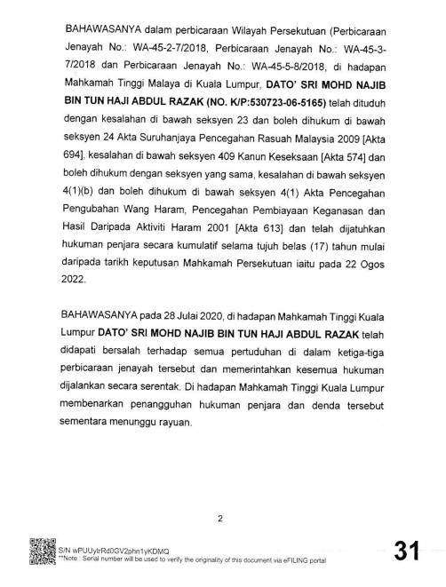 (i) On 28 July 2020 the Applicant was convicted by the Kuala Lumpur High Court punished with imprisonment for a term of 12 years and a fine of RM210 million in what has come to be known as the SRC Case;