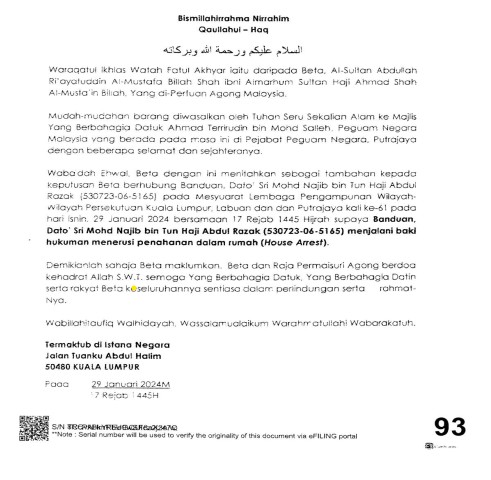 (viii) On 12 February 2024, the Applicant claimed to have received reliable information that in addition to the Early Release Order dated 29 January 2024, the YdPA had issued a supplementary order ('Addendum Order') which states that the Applicant is to serve the reduced sentence of his imprisonment under the condition of home arrest, instead of confinement in Kajang Prison;